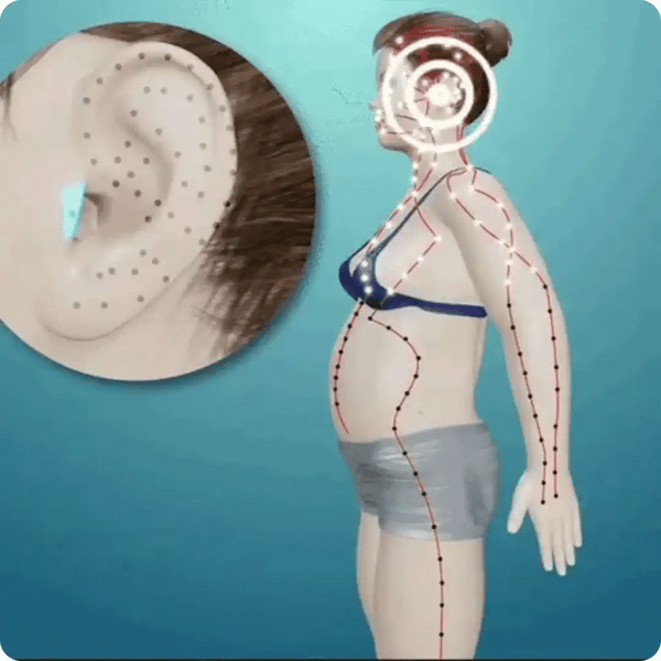 Aplican presión en el "punto del hambre", que se encuentra en la parte más externa de la oreja. Al aplicar presión con este pendiente en este punto durante todo el día, puede ayudar a reducir los antojos y suprimir el apetito.