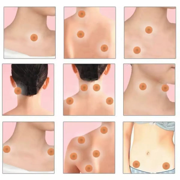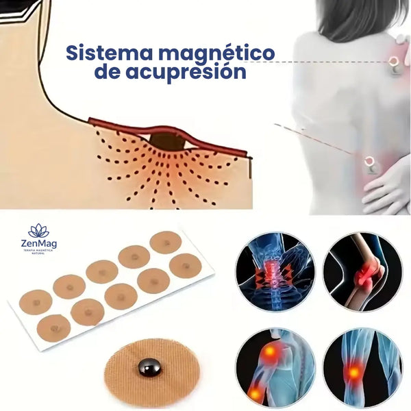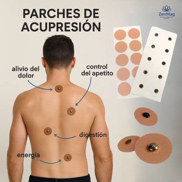 Cada parche combina un imán terapéutico y una base adhesiva natural que se coloca en puntos específicos del cuerpo (como orejas o cuello).