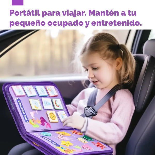 Este tablero de actividades está fabricado con materiales de alta calidad y tiene un diseño encantador, lo que lo hace duradero y seguro. Es ligero y compacto, por lo que cabe fácilmente en la pañalera. Un compañero de viaje ideal para entretener a los más pequeños durante los viajes.